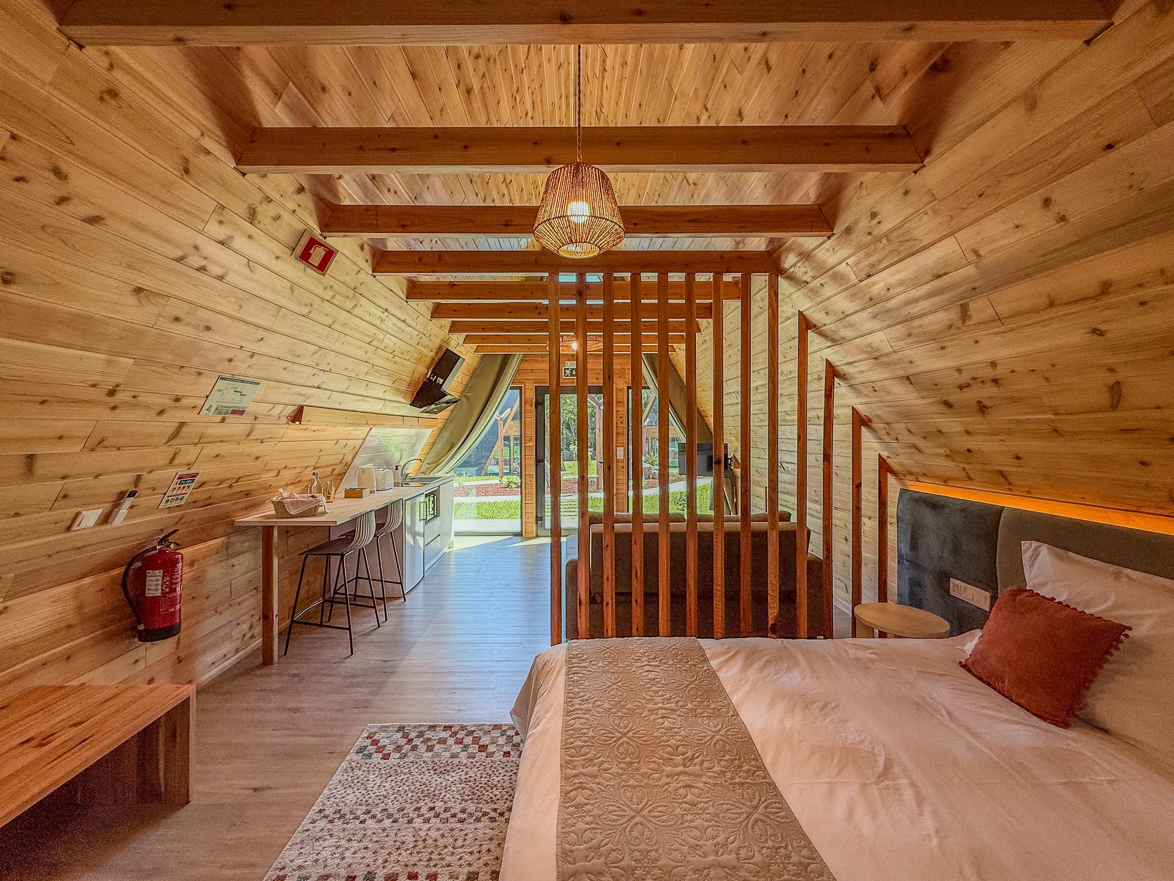 Ideal for families or small groups, our One-Bedroom Villa (55 m²) combines comfort, functionality, and charm.It features a master bedroom, a cozy mezzanine, a spacious living room, a fully equipped kitchenette with dining area, and a complete bathroom. The villa opens onto a private outdoor area, perfect for moments of rest and tranquility. It’s a practical, elegant, and welcoming option for those who value extra space without compromising on comfort or quality. The villa accommodates up to five guests two in the master suite and the remaining in extra beds.